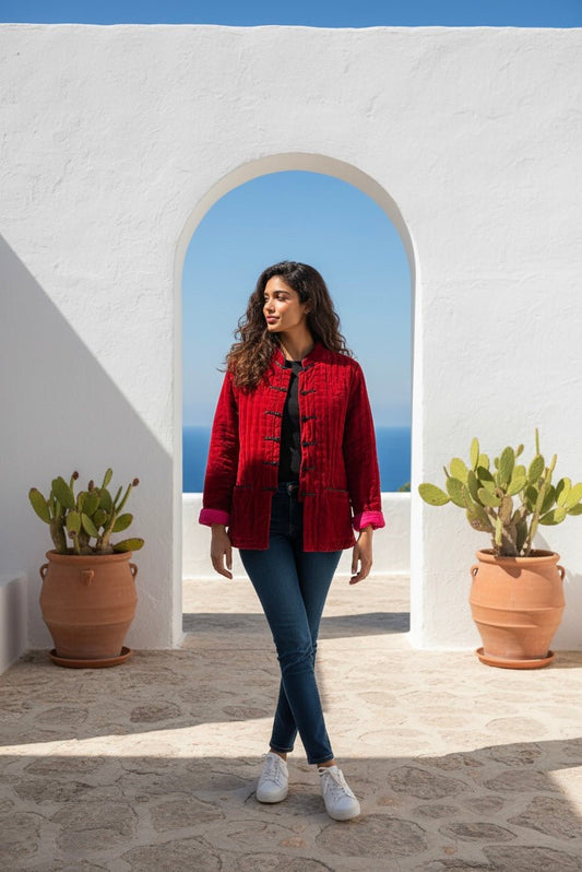 Jacket Women - Chinese Panne Velvet Jacket Strawberry with Hand Embroidery