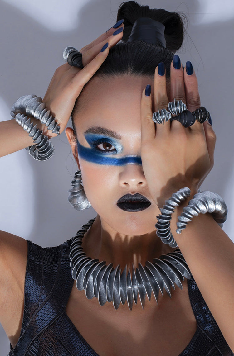 Orlando and Lucia's jewelry and fashion accessories are distinctive for their bold personality and strong aesthetic impact, drawing inspiration from geometric, natural, architectural, and contemporary graphic elements. The pieces feature either decorative, voluminous shapes or elegant, minimalist designs. Thanks to 3D printing, they are exceptionally lightweight and flexible, allowing them to interact harmoniously with the body.