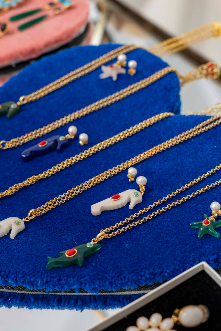Each piece is hand made using selected semiprecious stones which are hand carved specially for our designs, calibrated, and all of them mounted on 24k gold layered brass.