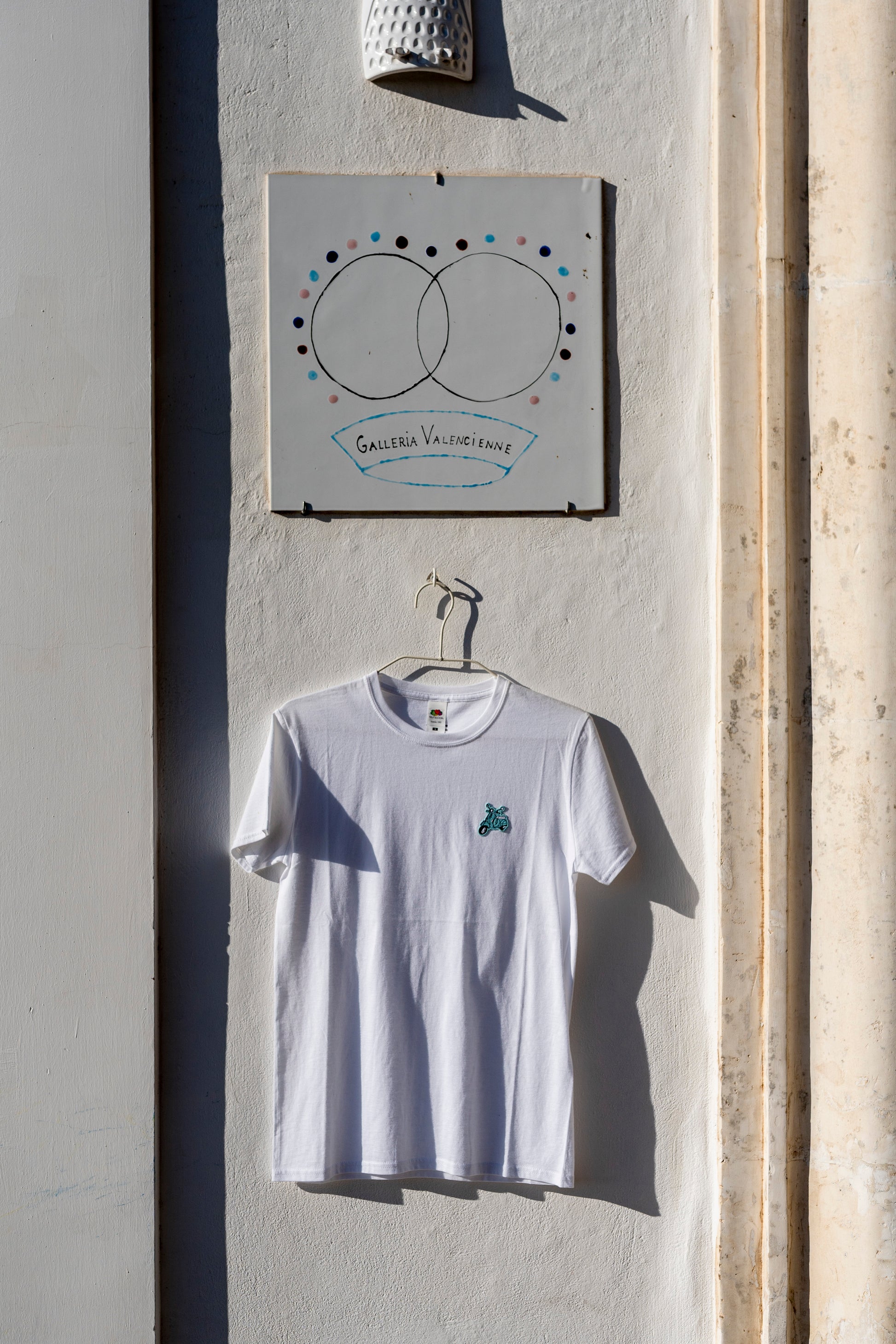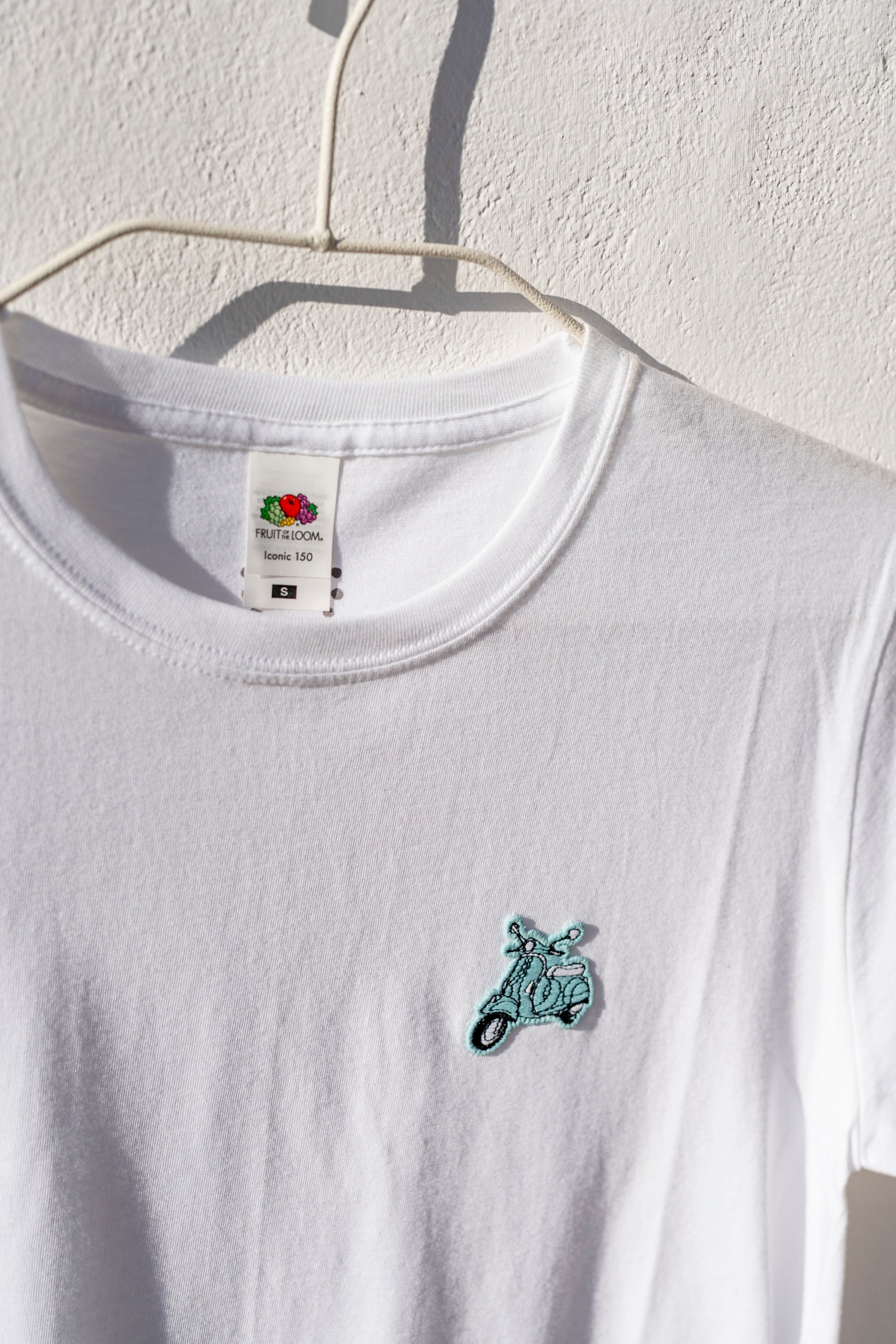 Embroidered patch embroidered turquoise Italian iconic vespa stylisée by our graphic designer Noogaman
