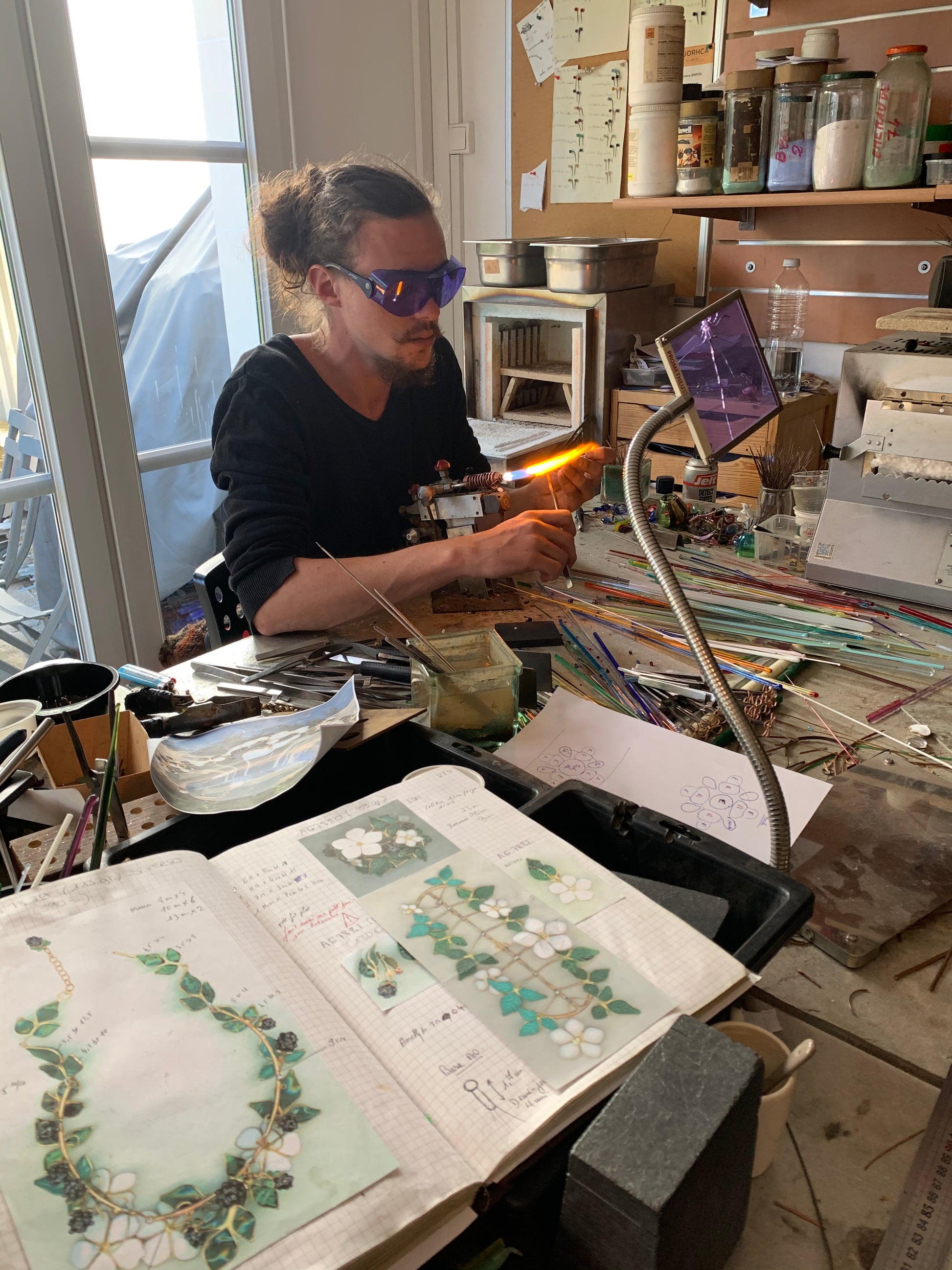 Chaque bijou est réalisé avec une technique d'émaillage très plat, étonnamment léger, laissant passer la lumière à travers la pâte de verre opale ou transparente.