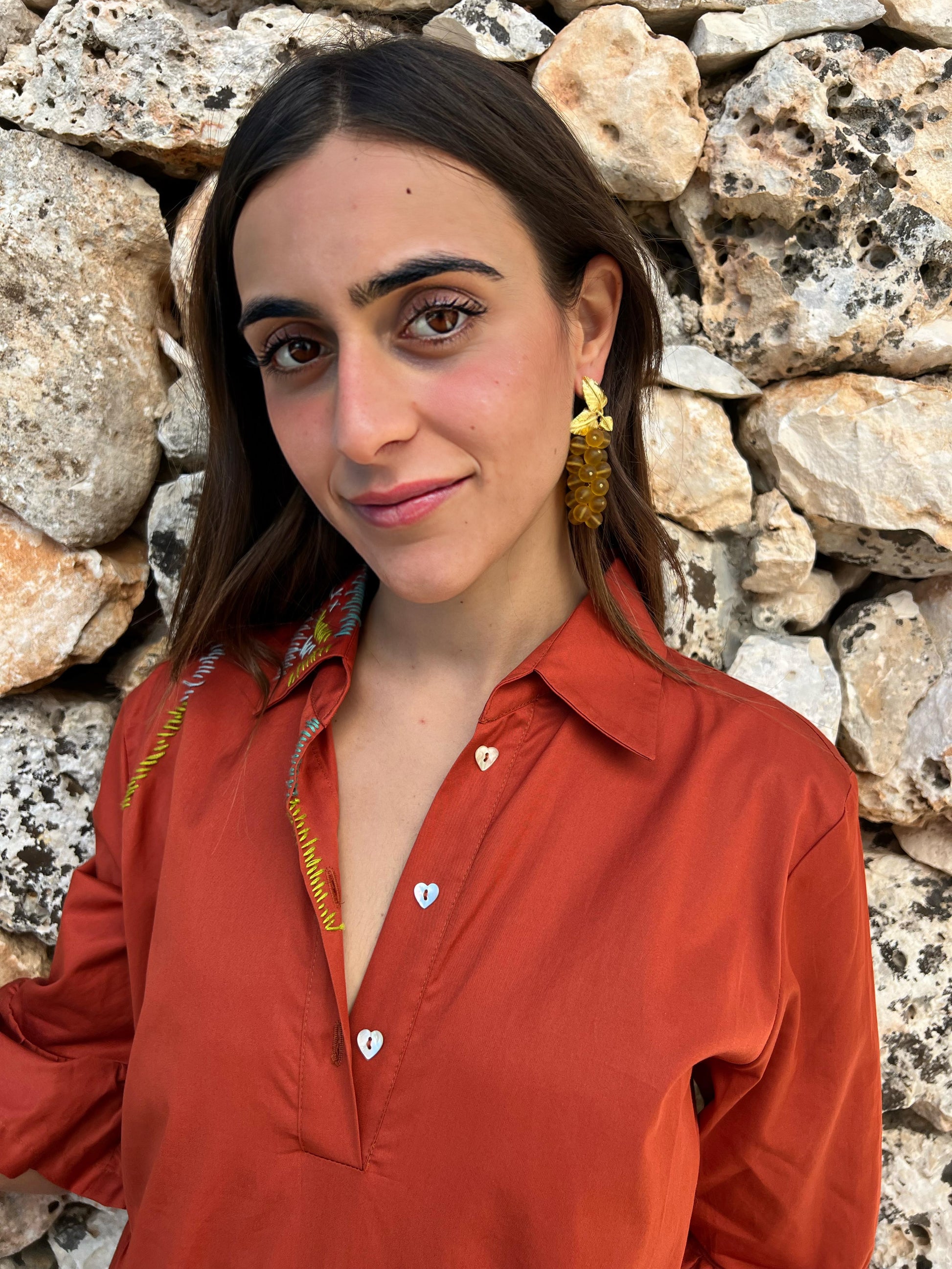 Notre mannequin porte notre robe Chiara brodée en mordoré.