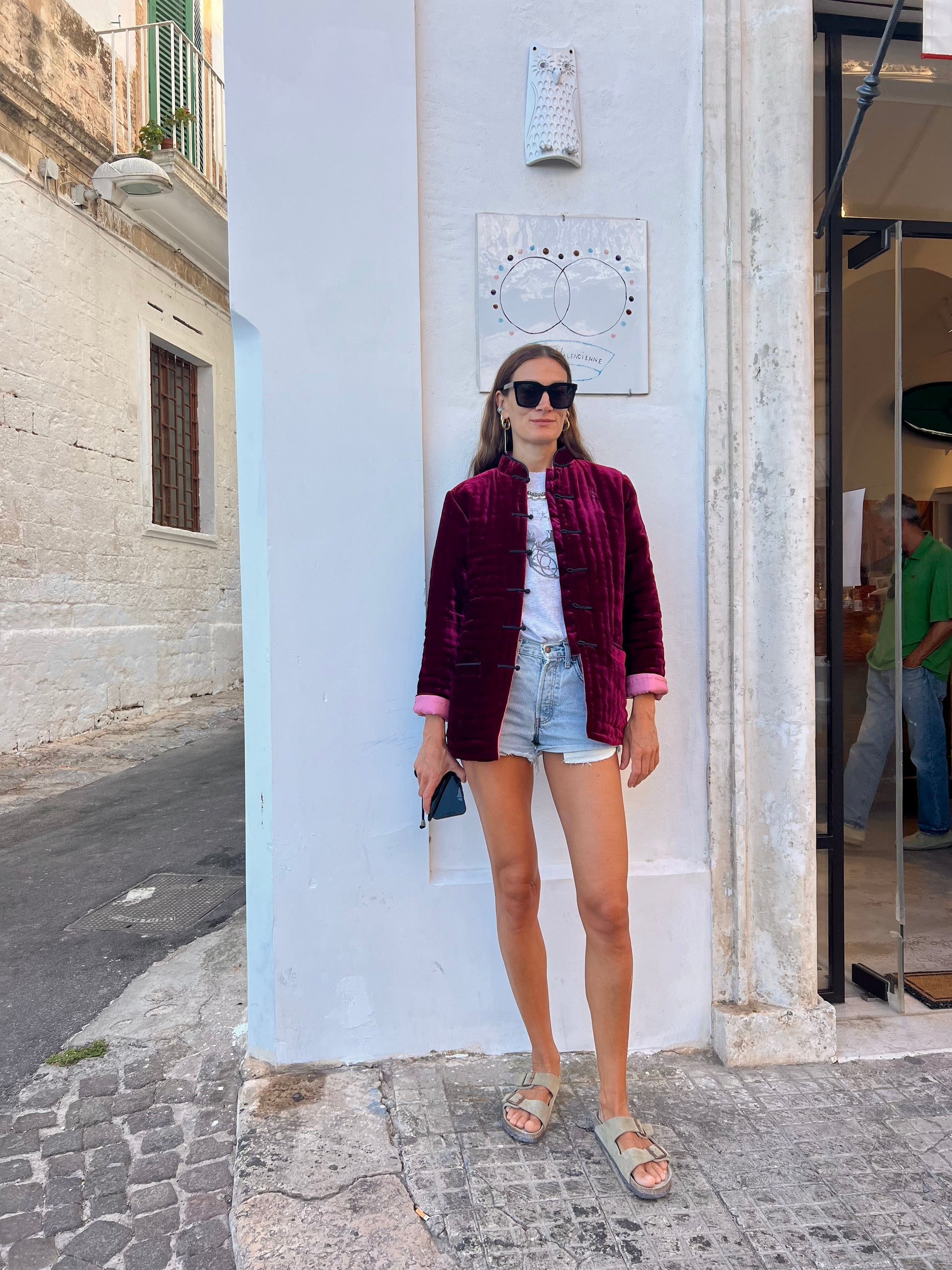 Veste Femme - Veste en velours de soie fraise/rose clair avec broderie à la main