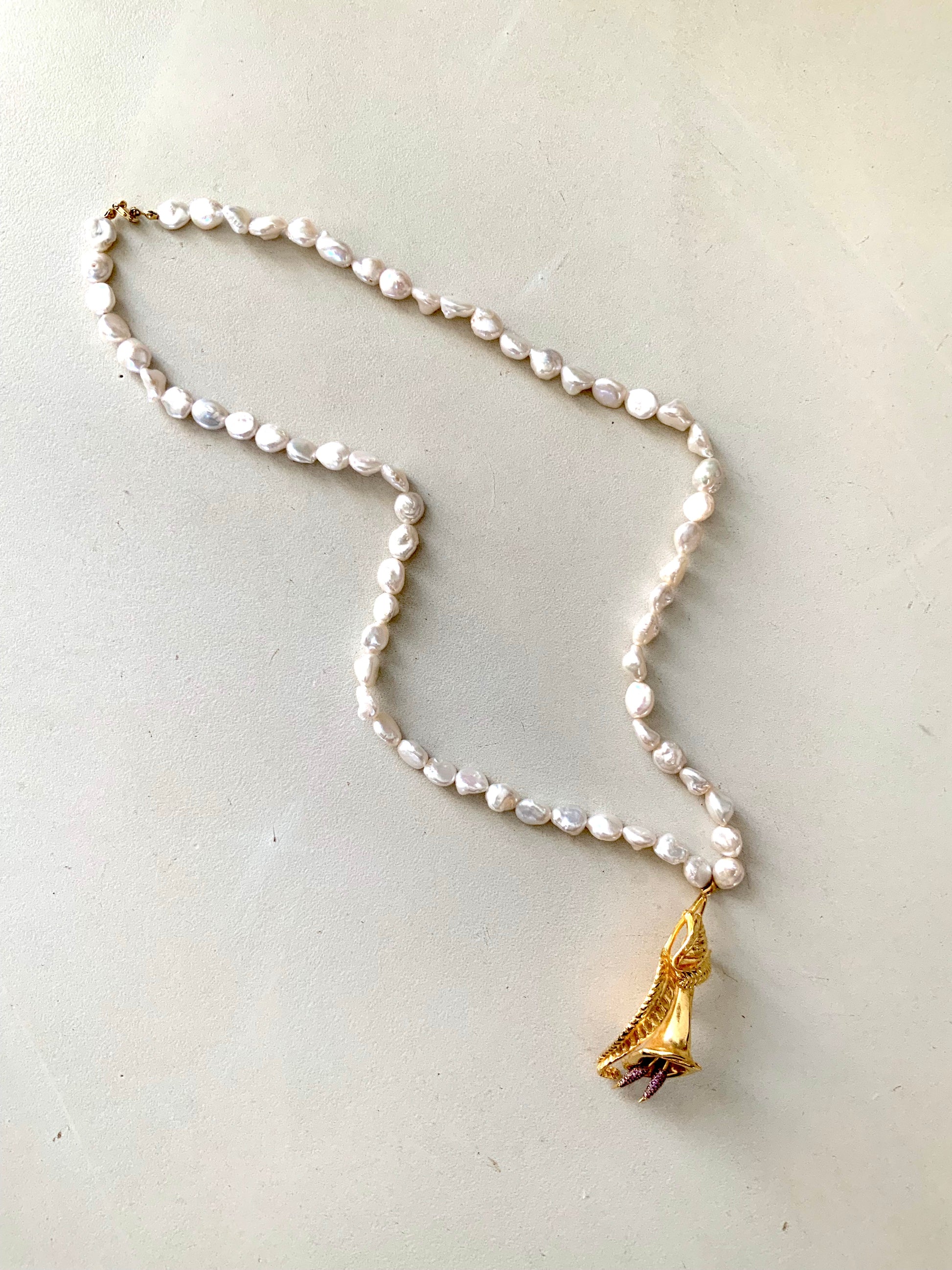 BRONZE PLAQUÉ OR 24K 1 MICRON, FERMOIR ARGENT, VÉRITABLES PERLES BAROQUES, CRISTAUX SWAROVSKI, DIAMÈTRE : 60 + 5 CM PENDENTIF