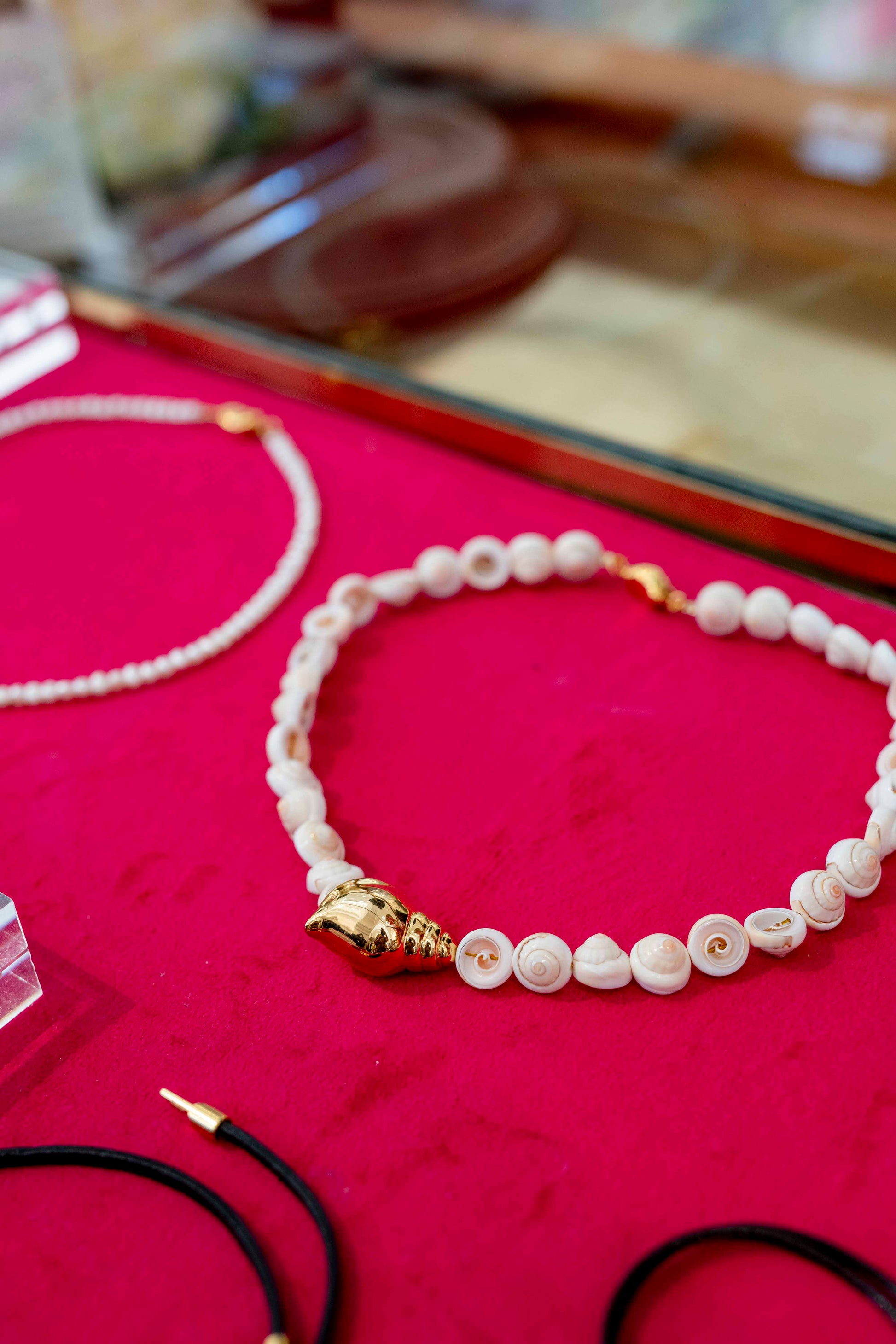 Collier joyeux coquillages naturels de Sainte Lucie avec pendentif gros coquillage en or plaqué or.