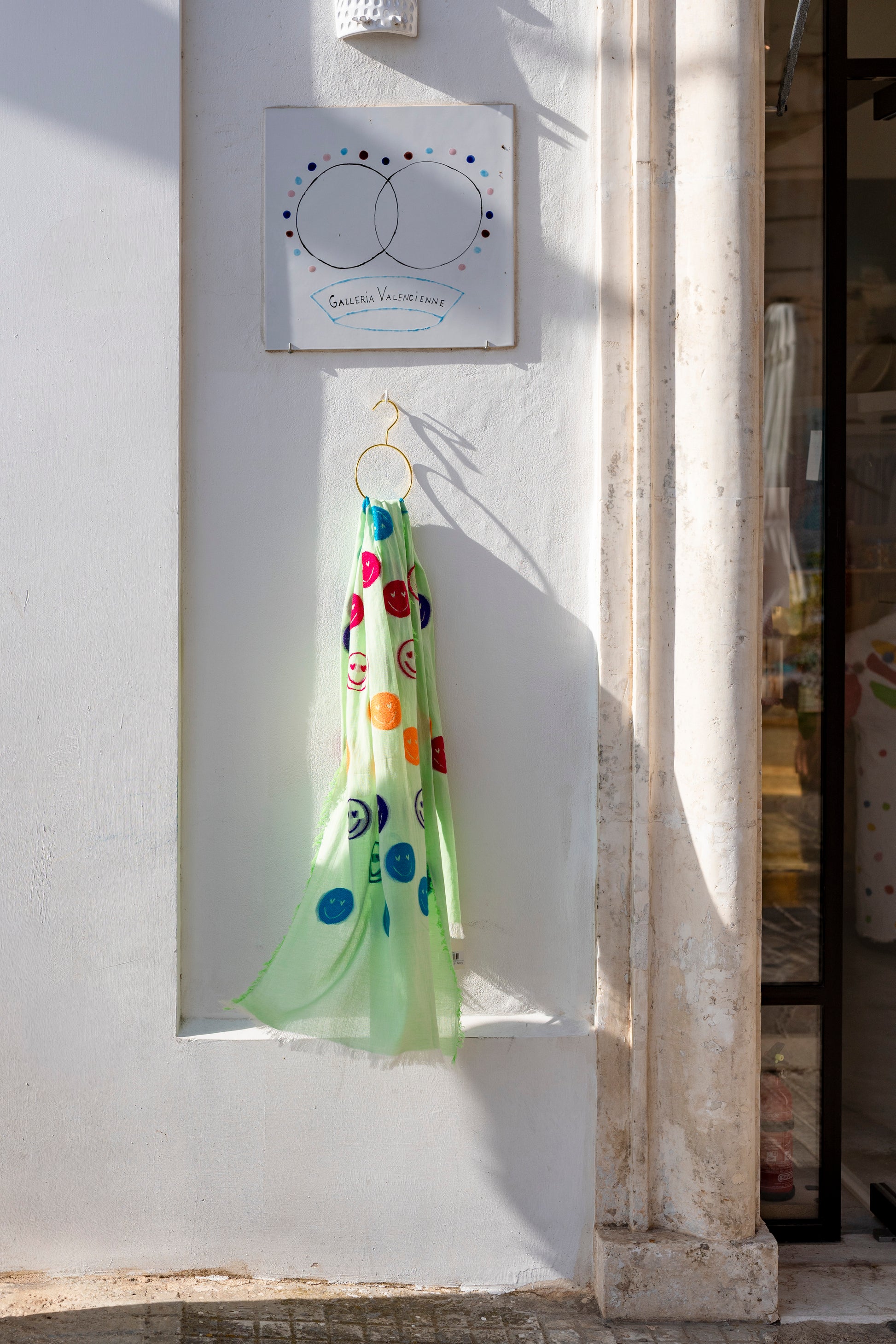 Foulard en coton vert avec smileys brodés aux couleurs contrastées. Franges effilochées. Couleurs vives et éclatantes. Édition limitée par DrBloom.