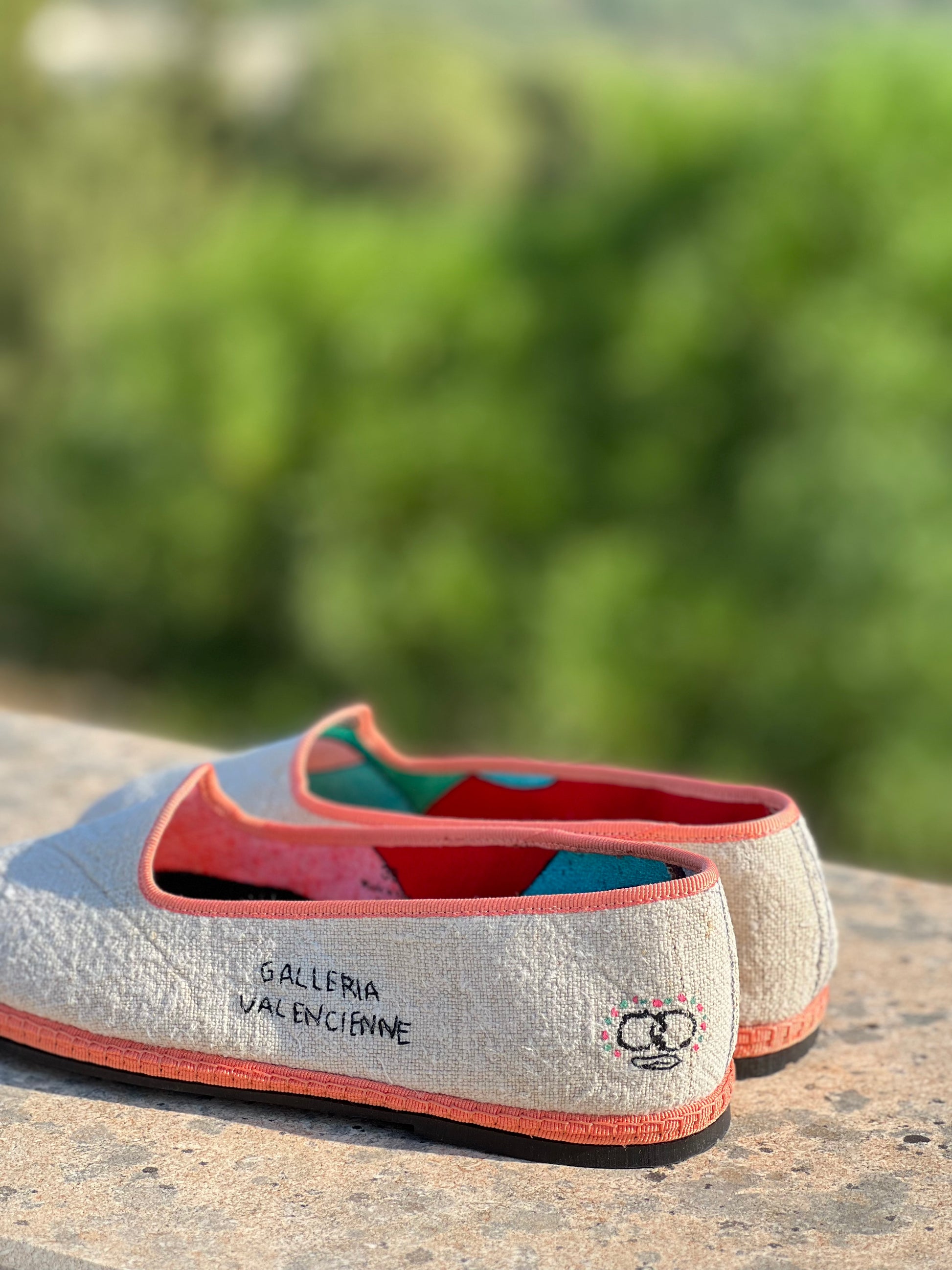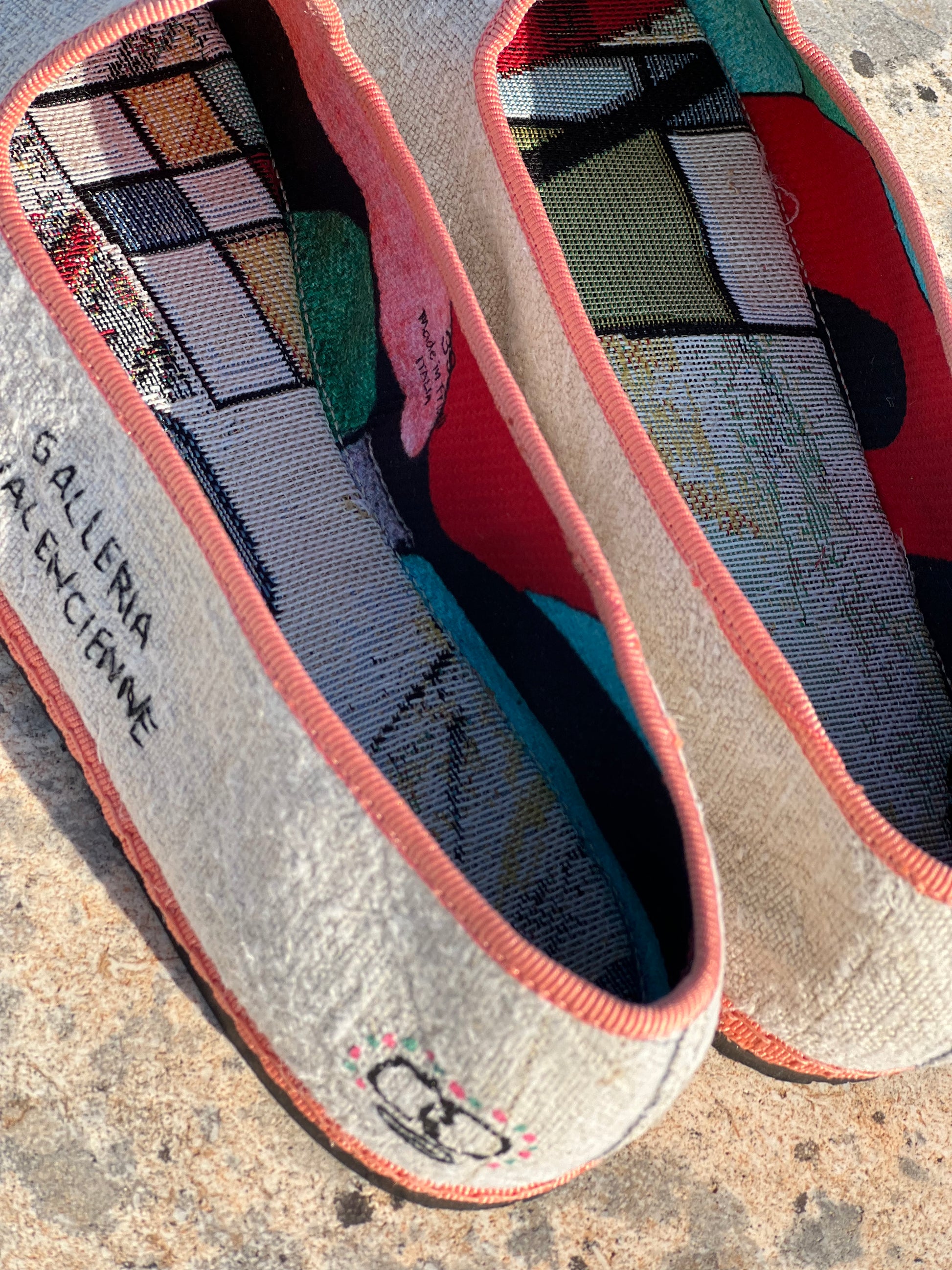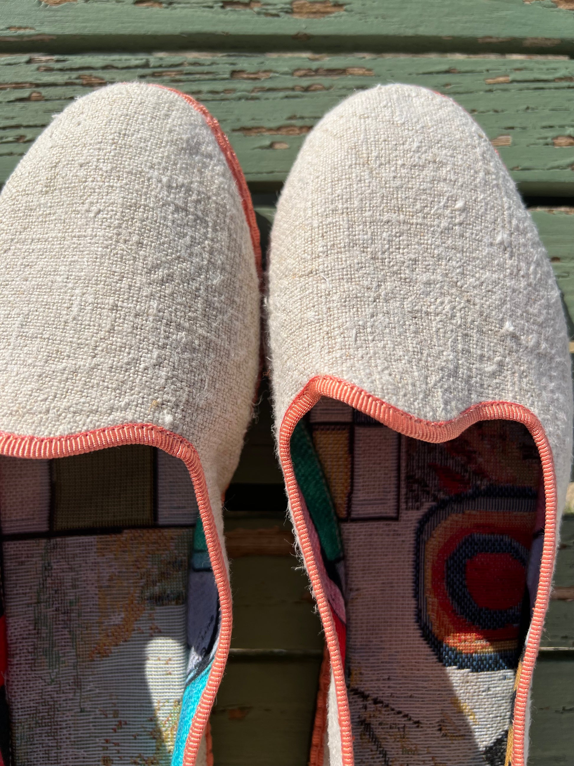 Ces friulanes sont fabriquées à partir de la récupération d'un ancien tissu de coton