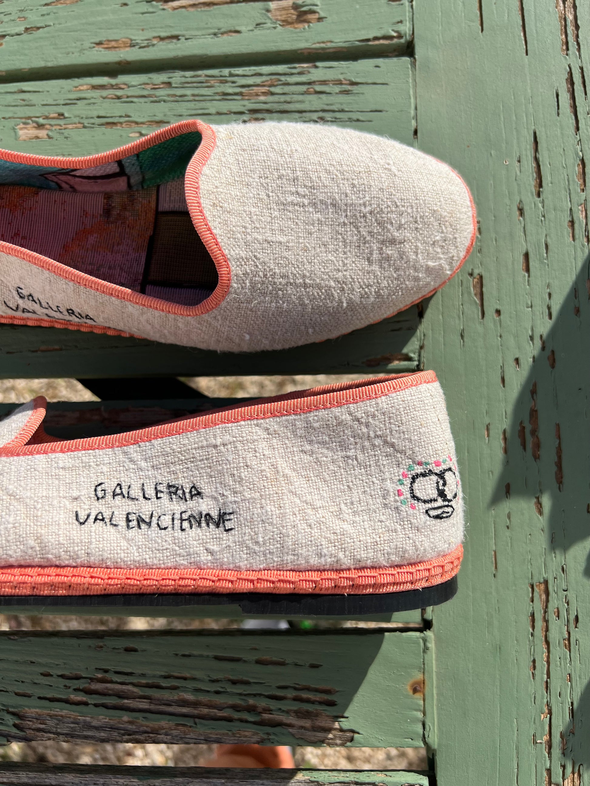 Sur le côté droit de chaque friulane est brodé le logo de la «galleria» et vers le talon est brodée la base d'une couronne tandis que les deux cercles et les points sont peints à la main.