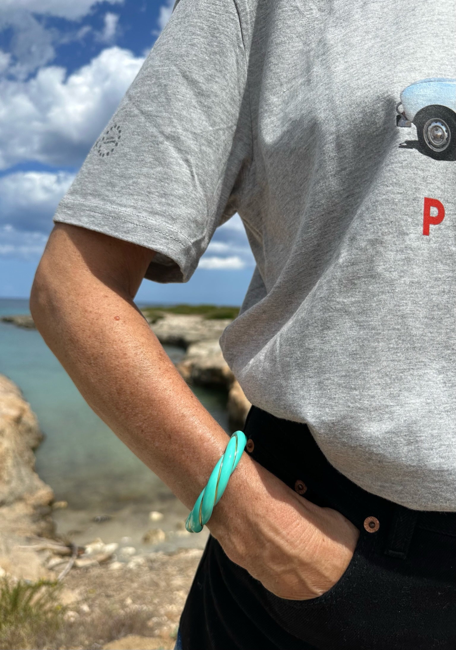 This twisted bangle in Turquoise colored bakelite is covered with yellow gold 750/1000 yellow gold thread that become a liana or wisteria.