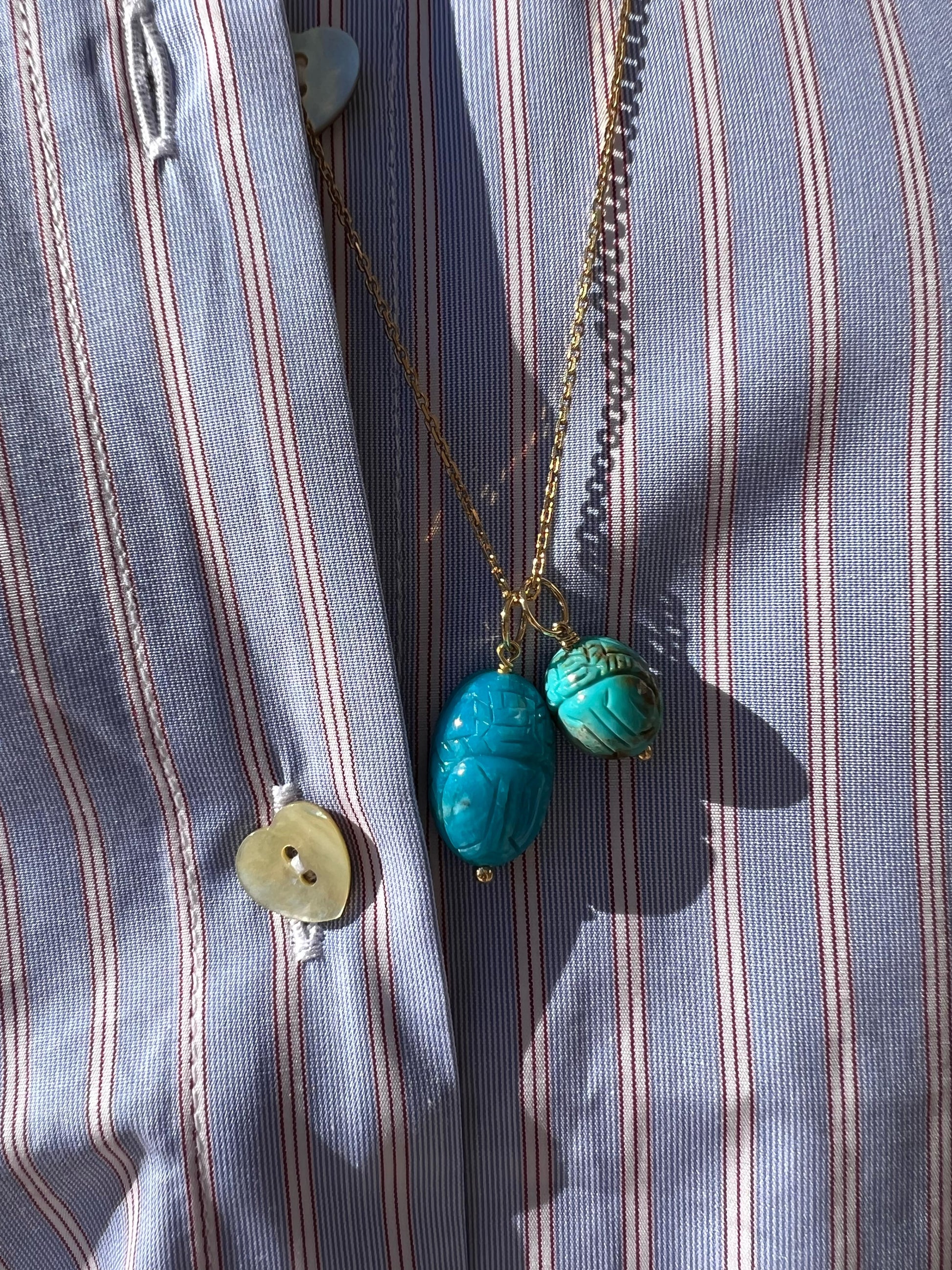 You can add, as shown in the photo, the gold chain 750/1000 of 70 cm and one more smaller Turquoise Scarab pendants from the high Jewelry collection, sold separately.